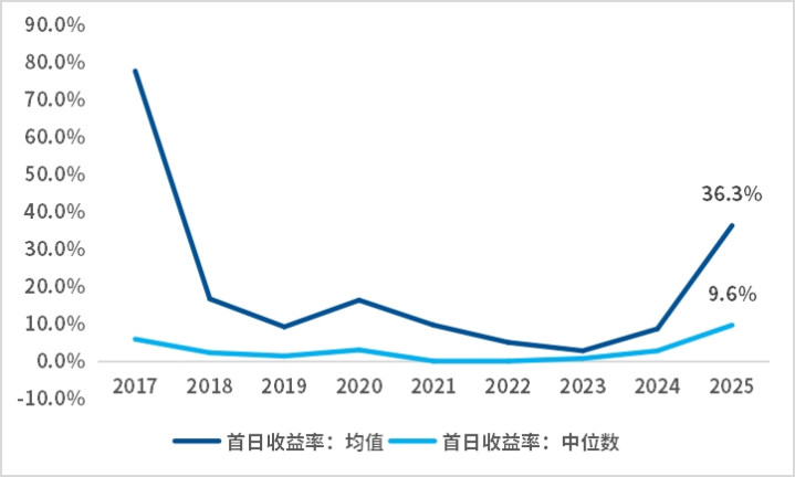 此外,根据wind统计来看,自21年以来港股打新胜率持续走高,截至2025年打新胜率已经抬升至73%。从打新首日收益率角度来看,2025年首日收益率均值、中位数均大幅提升至36.3%、9.6%,均为自2018年以来新高。打新胜率、打新收益的趋势性提升也有望持续提高市场对港币的需求,进而促进流动性的进一步释放,边际上对港股估值有提振作用。