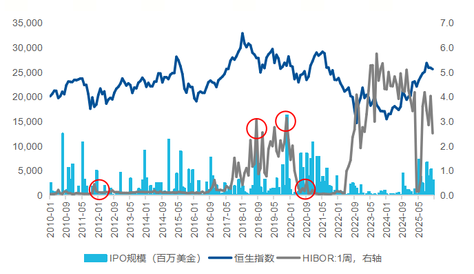 2023年11月FINI系统启用后,投资者参与公开发售认购不再需要缴纳全额认购额,实际的冻资规模将低于用全额认购资金计算的冻资规模。25年以来港股IPO募集规模明显扩大,尤其在25Q1,布鲁可、蜜雪集团的公开发售有效认购倍数分别达到了6000倍、5258倍,公开发售认购总规模分别达到0.9万亿、1.8万亿(但由于FINI系统,实际冻资规模将明显低于总认购规模),但HIBOR短端利率仍平稳向下。甚至在25年5月,IPO募资规模由上月的约30亿港币提升至超550亿,再加上企业分红回购、南向与外资流入共同影响下,港元需求十分强劲,触及7.75强方兑换保证水平。为此,香港金管局于5月初向银行间市场注资约1294亿港元,释放流动性,促使HIBOR大幅回落至历史低位,而恒生综指在5月收涨超过5%。由此可见,港股IPO在特定条件下不仅不会导致市场走熊,甚至可能会由于市场对于港元的需求激增,促进流动性的释放,降低HIBOR利率,进一步提振港股的上行。
