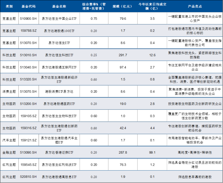 易方达基金旗下主要投资于港股类的产品管理规模达到919亿元。目前,公司已布局14只港股相关ETF,覆盖宽基指数、核心行业(互联网、医药、消费、汽车、证券)、红利策略等多个方向,为投资者提供丰富工具选择。